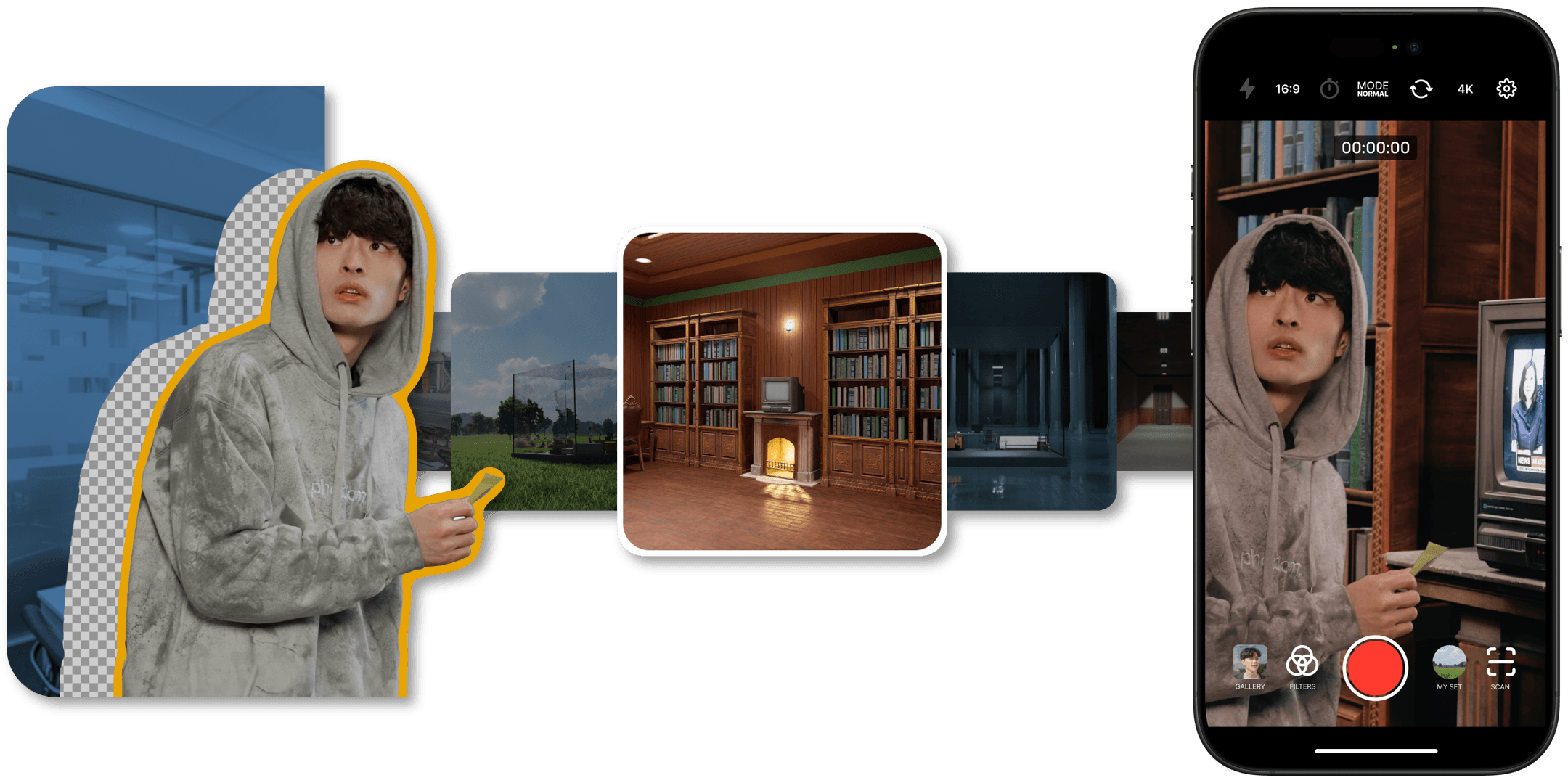 Leverage real-time automatic compositing with 3D virtual backgrounds, allowing you to realize creative scenes on mobile, no physical set required.